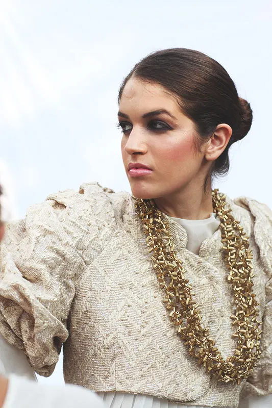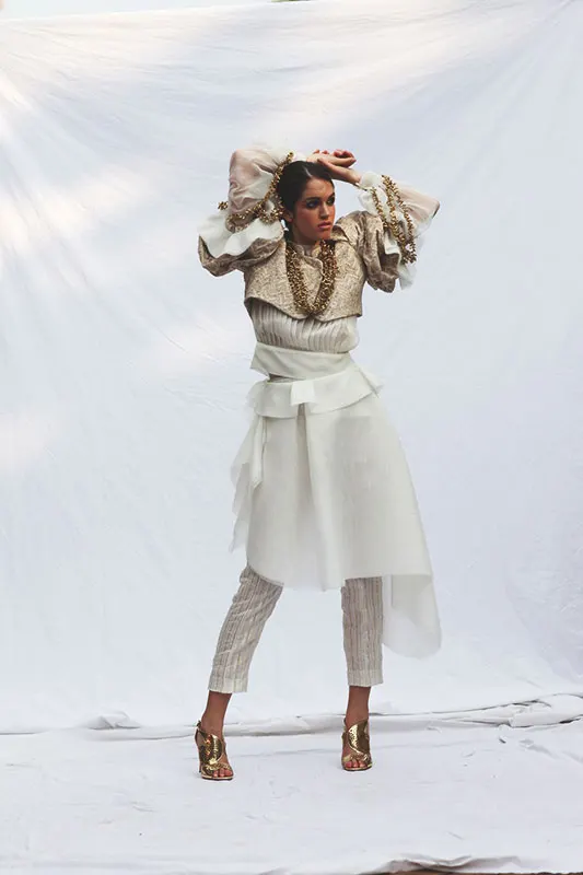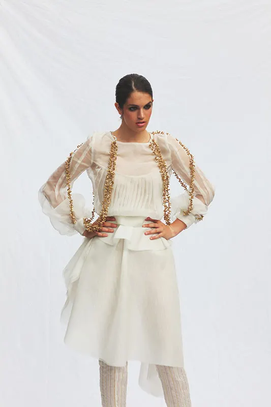 Passionate about fashion, customs, and tradition, Antonio Saturnino became passionate about the pasta tailoring project and designed the fourth dress in the collection. He was inspired by the company’s history, the cult of wheat, and the attachment to the land. A dress was born that celebrates the land and its fruits like a modern deity, made of precious, iridescent fabrics and transparencies that seek the light. Saturnino created a modern Rococo-inspired dress, generous in volume and simple in decoration, inspired by the traditional costumes of Molise folklore. A shiny silk jacquard featuring ears of wheat for the bolero. An explicit homage to tradition is the apron with a maxi rouge of generous layers of organza and the search for fabrics from the past, such as brocade, reminiscent of grandmother’s best dress. The only luxury: gold, yes, but that of the earth that nourishes and never disappoints, that of the wheat fields that always guarantee at least daily bread.