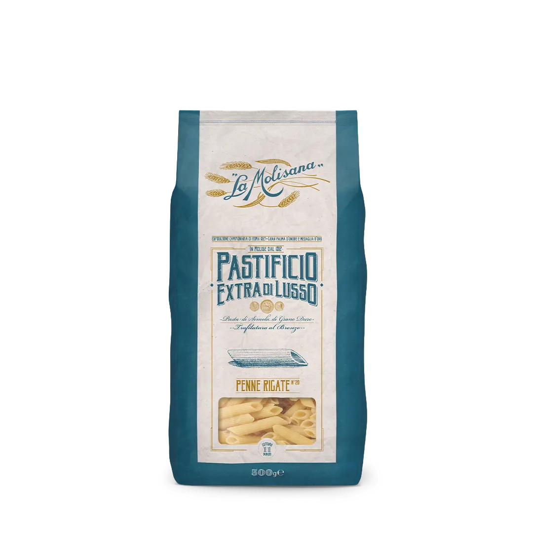 Le Penne Rigate 20 rappresentano la continuità di una tradizione familiare fatta di passione e competenza. Le righe profonde e il taglio obliquo catturano il sugo in ogni scanalatura, mentre la semola ricca di proteine garantisce un’eccellente tenacità. Perfette per un ragù rustico di salsiccia e pomodoro, raccontano il sapore schietto della cucina italiana.