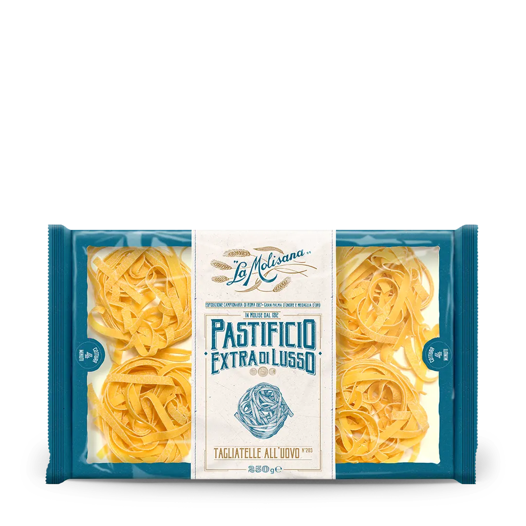 Dorate, ampie, regolari: le Tagliatelle 203 sono un inno alla tradizione italiana. L’uovo dona colore e fragranza, la semola selezionata garantisce una tenacità perfetta. Ideali con ragù e salse cremose, si fanno amare nella ricetta con tartufo e affumicatura di castagno: un viaggio aromatico tra bosco, terra e ricordi autentici.