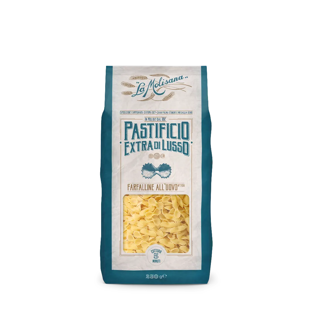 Le Farfalline 208 racchiudono l’anima semplice della cucina di casa. Il centro spesso e i bordi sottili offrono un piacevole contrasto tra compattezza e leggerezza. L’uovo dona fragranza e colore naturale. Perfette in brodo o con sughi leggeri, sono la pasta della quotidianità, quella che scalda il cuore con la semplicità più autentica.