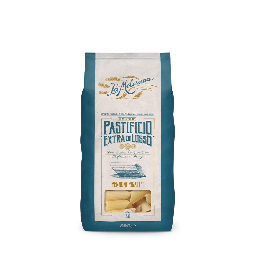 I Pennoni Rigati 21 nascono da grani ad alto contenuto proteico, trasformati in una semola vigorosa e trafilati al bronzo per ottenere una texture porosa e ruvida. Ampi e imponenti, sono perfetti per trattenere sughi ricchi o preparazioni al forno. Provali nella nostra ricetta con ragù bianco, carciofi e ricotta salata: un piatto raffinato, profumato e sorprendente.