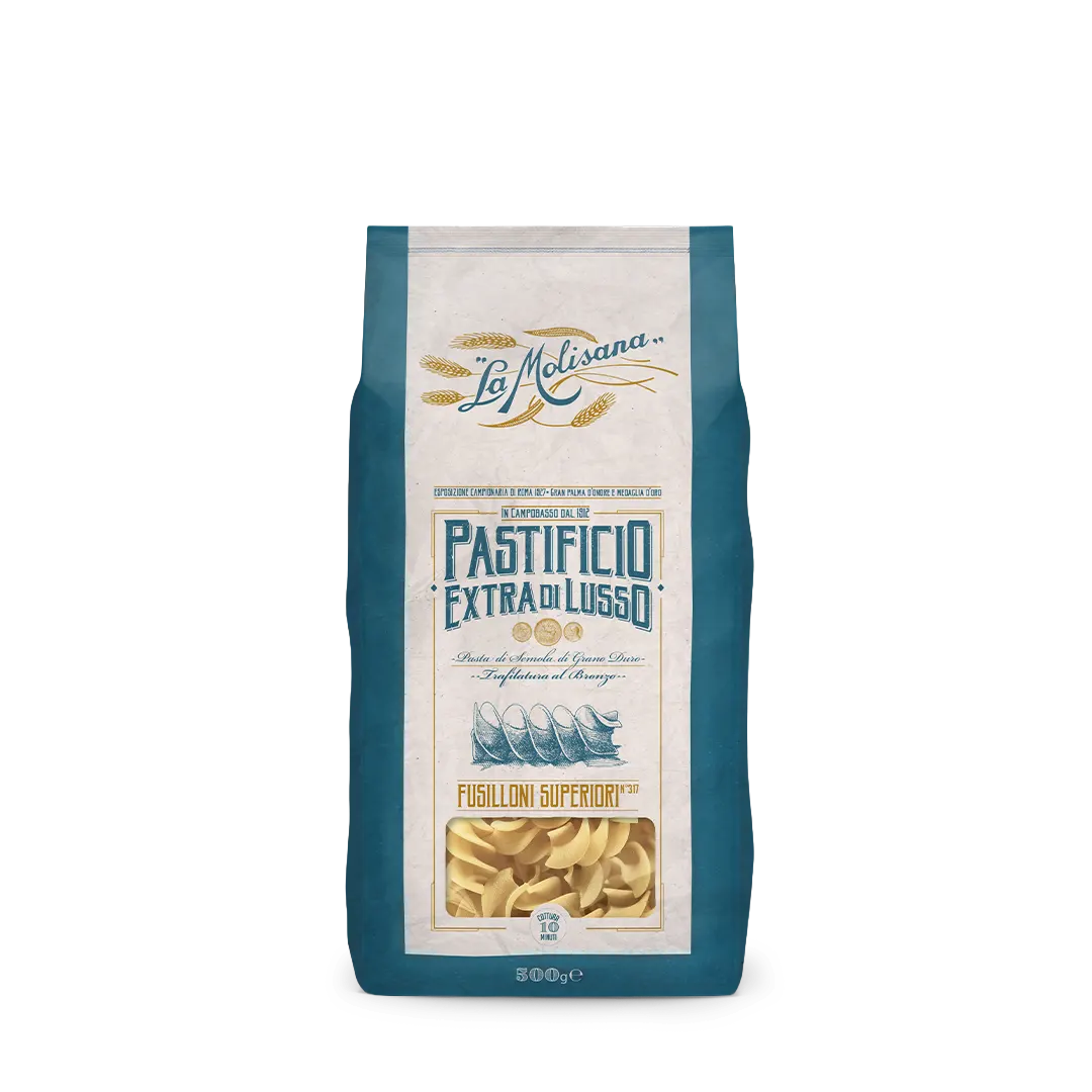 I Fusilloni Superiori 317 avvolgono i condimenti con le loro spirali ampie e decise. Nati da grani selezionati e lavorati con trafilatura al bronzo, offrono una texture corposa e una tenuta perfetta. Sono un formato generoso, protagonista in tavola. Ottimi con sughi densi o al forno: noi li amiamo con pomodoro confit e pecorino, per un gusto intenso e genuino.