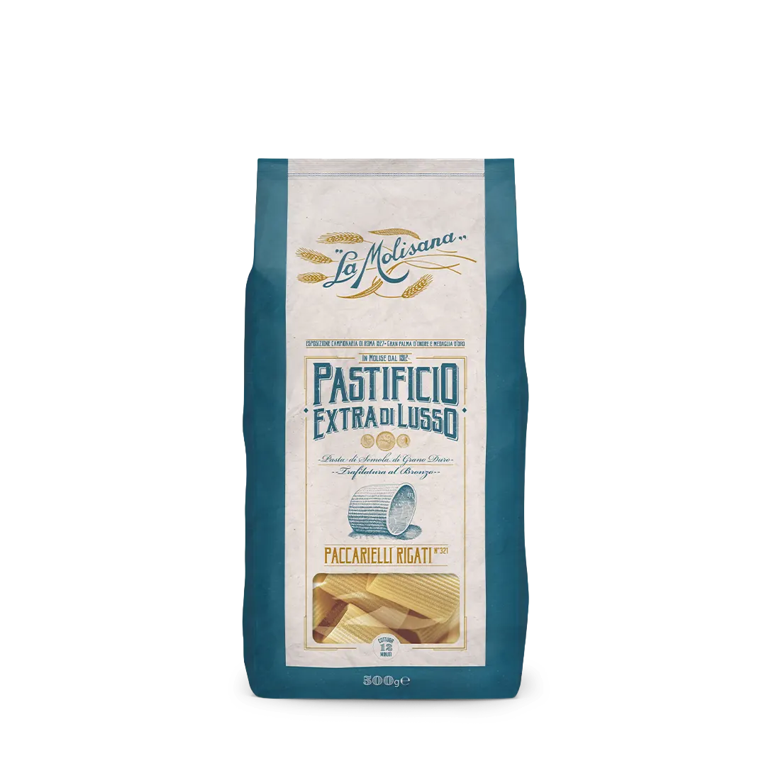 I Paccarielli Rigati 321 rinnovano la tradizione del pacchero con una rigatura marcata e una struttura vigorosa. Il grano duro di alta qualità e la trafilatura al bronzo donano corpo e porosità, rendendoli ideali per sughi mediterranei. Provali nella ricetta con pesce spada, pesto di agrumi e pistacchio: un’esplosione di freschezza, profumi e colore.