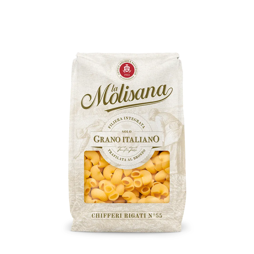 Di etimo probabilmente straniero, i chifferi hanno una forma decisamente particolare che ricorda una conchiglia di medie dimensioni pronta ad accogliere nelle sue cavità succulenti sughi e condimenti. Come tutto il resto della gamma, anche i Chifferi rigati 55 nascono dal grano più pregiato al mondo.