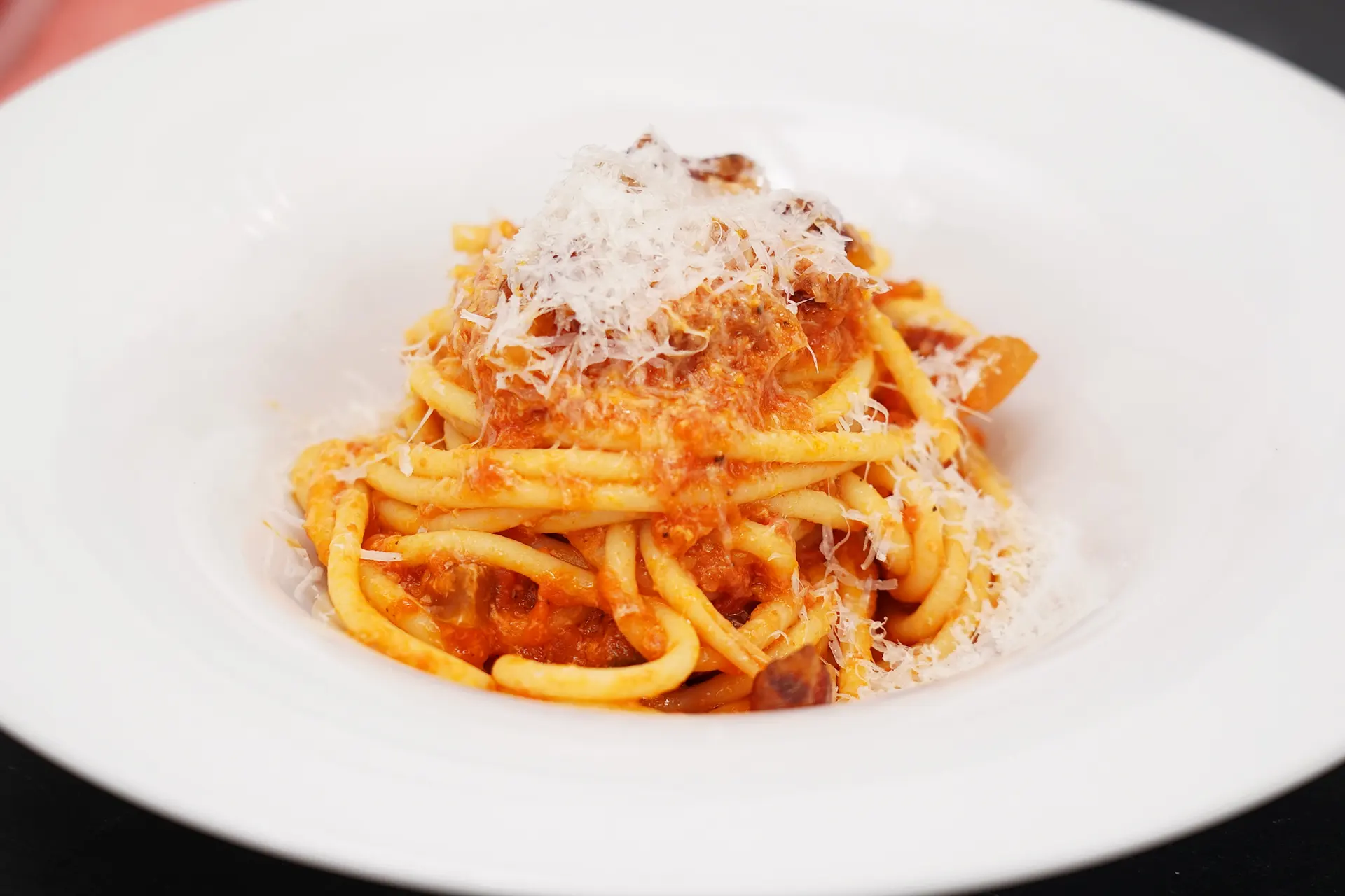Impiattare i bucatini e completare con ulteriore salsa e una grattugiata di pecorino romano.