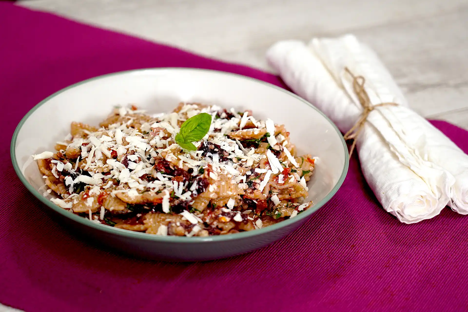 Lessare la pasta in abbondante acqua salata. Condire con la conserva di melanzane. Grattugiare all’interno abbondante ricotta salata, terminare con del basilico spezzettato a mano.