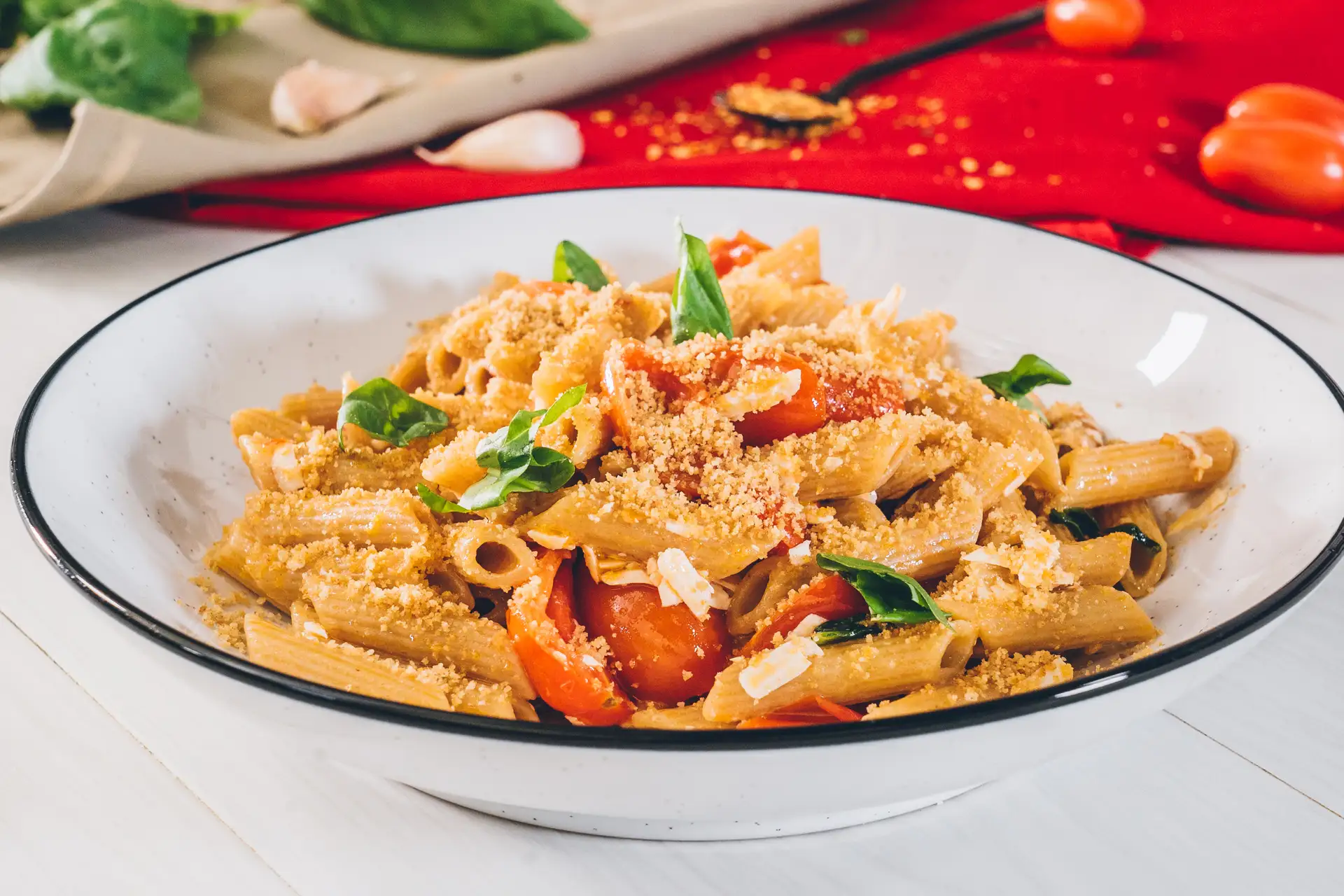 Fate bollire la pasta, scolatela e matecatela con il sugo di pomodoro. Aggiungete basilico spezzettato e ricotta salata. Finite con pangrattato e un filo di olio extravergine di oliva