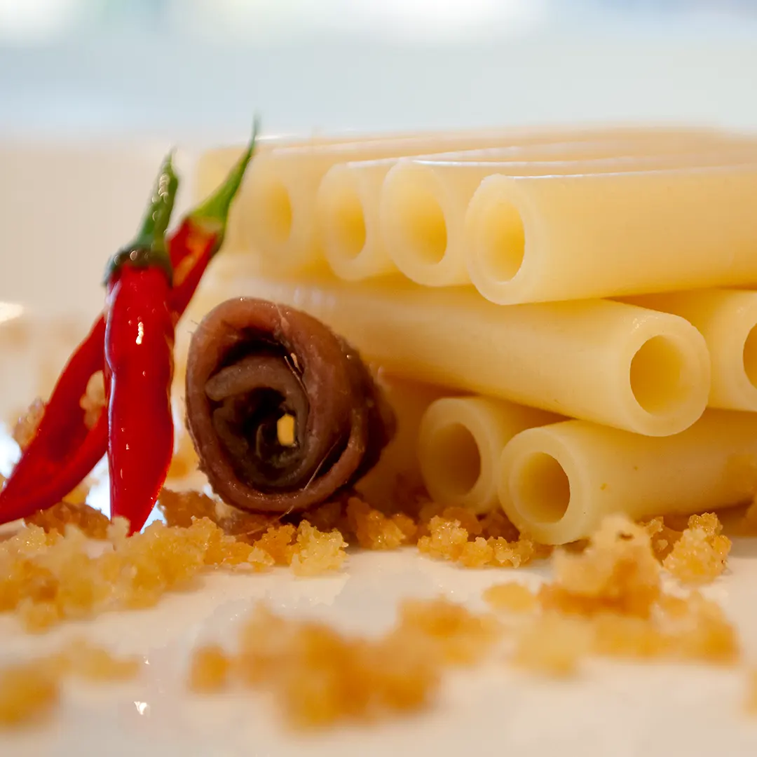 Cuocere gli Ziti Campani in abbondante acqua leggermente salata, scolare al dente. Saltare la pasta in padella con la salsa di acciughe e la mollica di pane tostata.