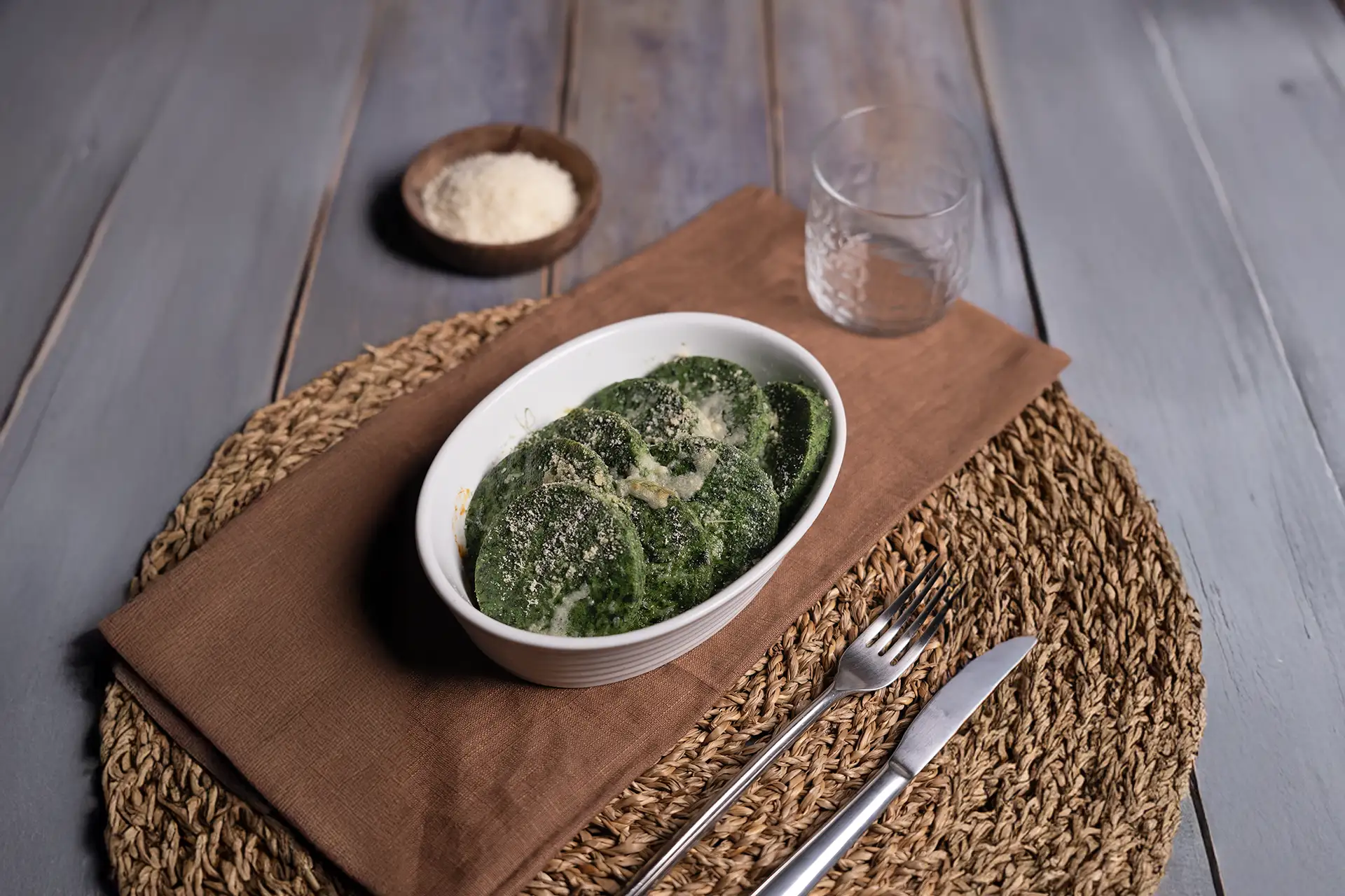 Lessa gli spinaci in poca acqua. Scolali, strizzali bene e frullali nel mixer con metà parmigiano e un pizzico di sale.