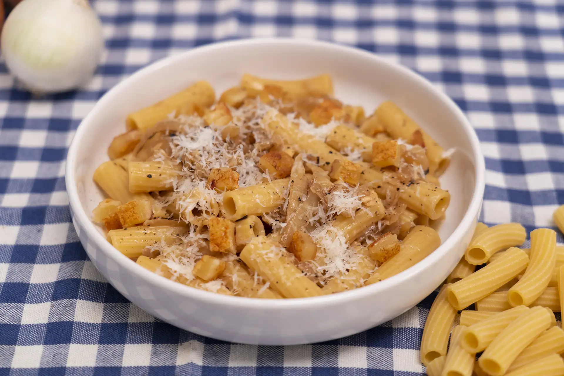 Assaggiando questo primo piatto siamo sicuri che non saprete decidervi se si tratta davvero di un piatto di recupero quale è, oppure di una piattino gourmet. Questo per colpa della cipolla che con il suo gusto dolce e inconfondibile trasforma i piatti di cui è protagonista in vere e proprie prelibatezze. Ricetta antispreco perché sia della cipolla che del formaggio si utilizzano tutte le parti che normalmente vengono invece scartate. Le bucce delle cipolle e le croste del formaggio infatti vengono usate da Chef Andrea per un brodo saporitissimo in cui verrà fatta risottare la pasta. Fondamentale per la buona riuscita della preparazione, è senz’altro anche la scelta del formato di pasta: i maccheroni valorizzano il condimento semplice grazie al loro carattere coriaceo che si mantiene anche dopo la cottura. Con questa ricetta, non potrete più appellarvi alla scusa che non avete ingredienti in casa neanche per preparare una pasta.