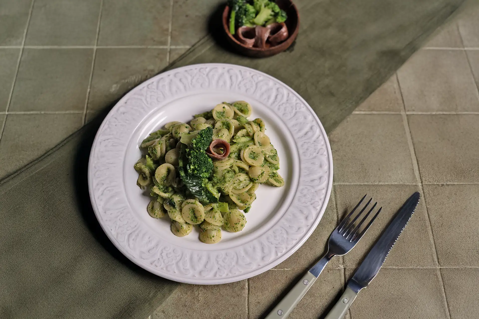 Scola la pasta e uniscila al sugo in padella. Manteca con un po’ di acqua di cottura. Servi e decora con un filetto di alice arrotolato e qualche cimetta di broccolo.
