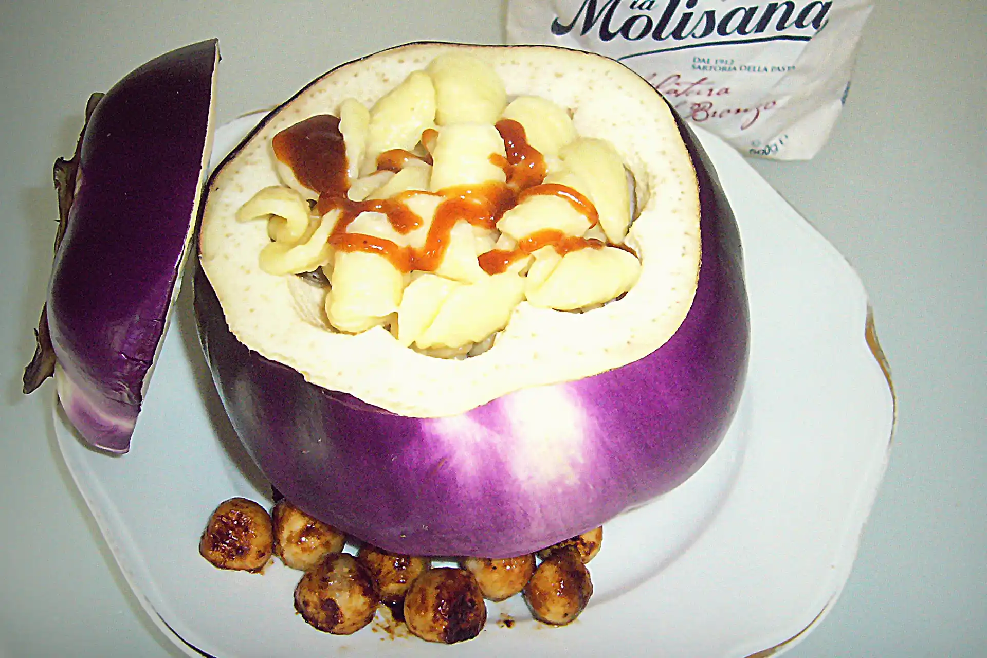 Cuocere le Orecchiette e adagiarle nella melanzana svuotata in cui al fondo si è già aggiunta la salsa liquida preparata, poi coprire la pasta con altra salsa. Infine guarnire la base del piatto con le palline di melanzana caramellate.