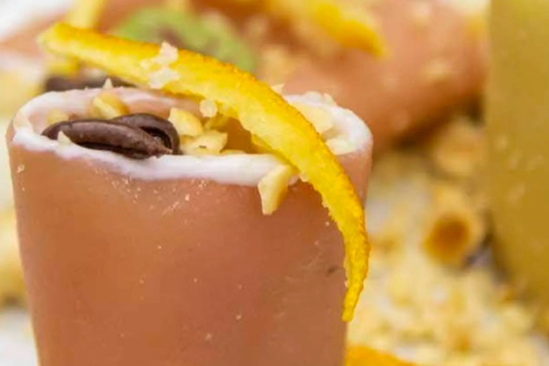 Mettere lo zucchero in una casseruola con poca acqua e portare ad ebollizione. Immergere lo zeste di arancia precedentemente tagliato a listarelle per realizzare dei canditi, quindi adagiare su un piatto e raffreddare.