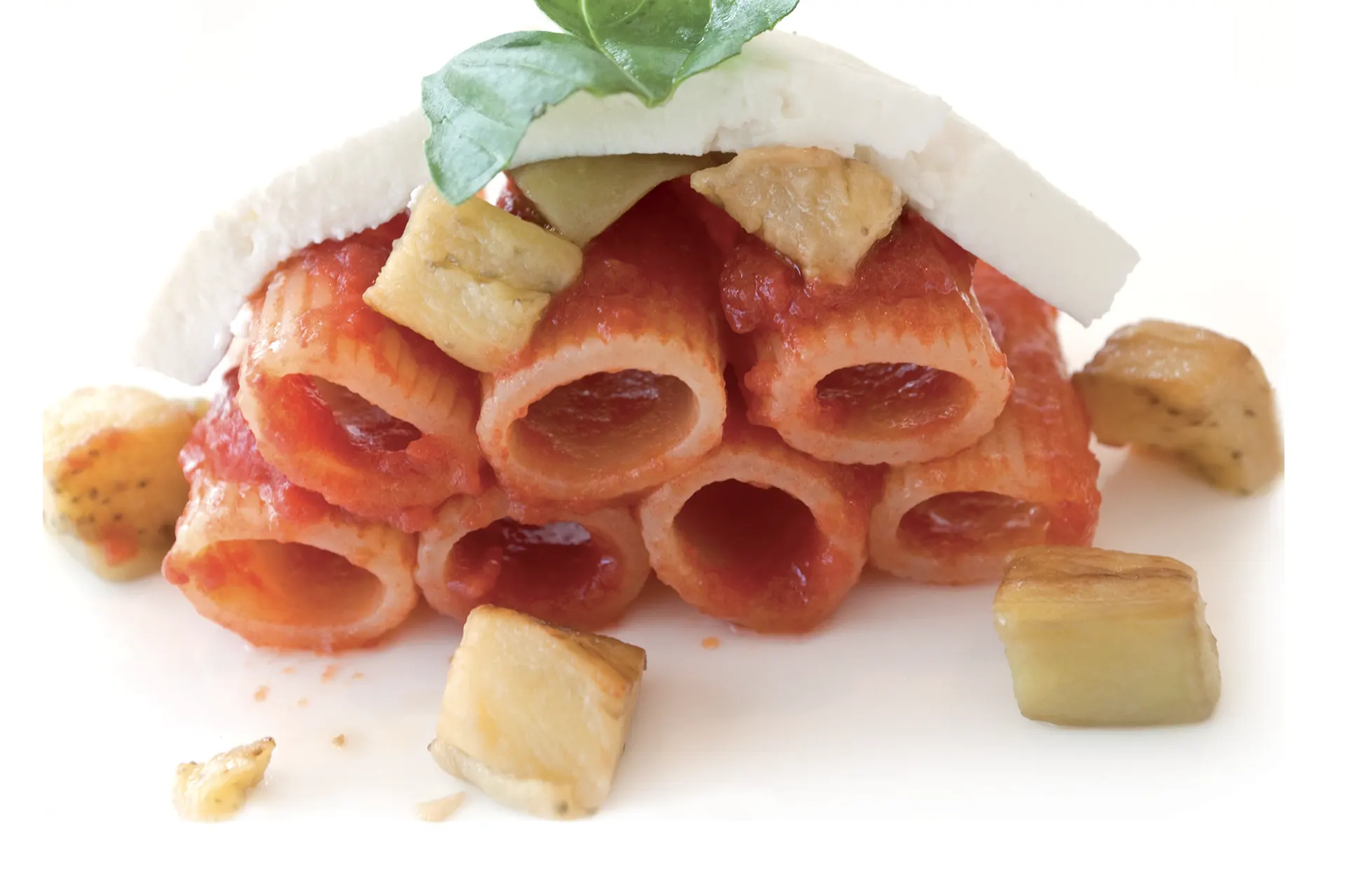 In una padella rosolare l’aglio nell’olio extravergine di oliva, aggiungere i pomodori pelati, salare e portare a cottura. Pelare le melanzane, tagliare la polpa a cubetti e rosolare in una padella antiaderente con un filo d’olio, salare e portare a cottura.
