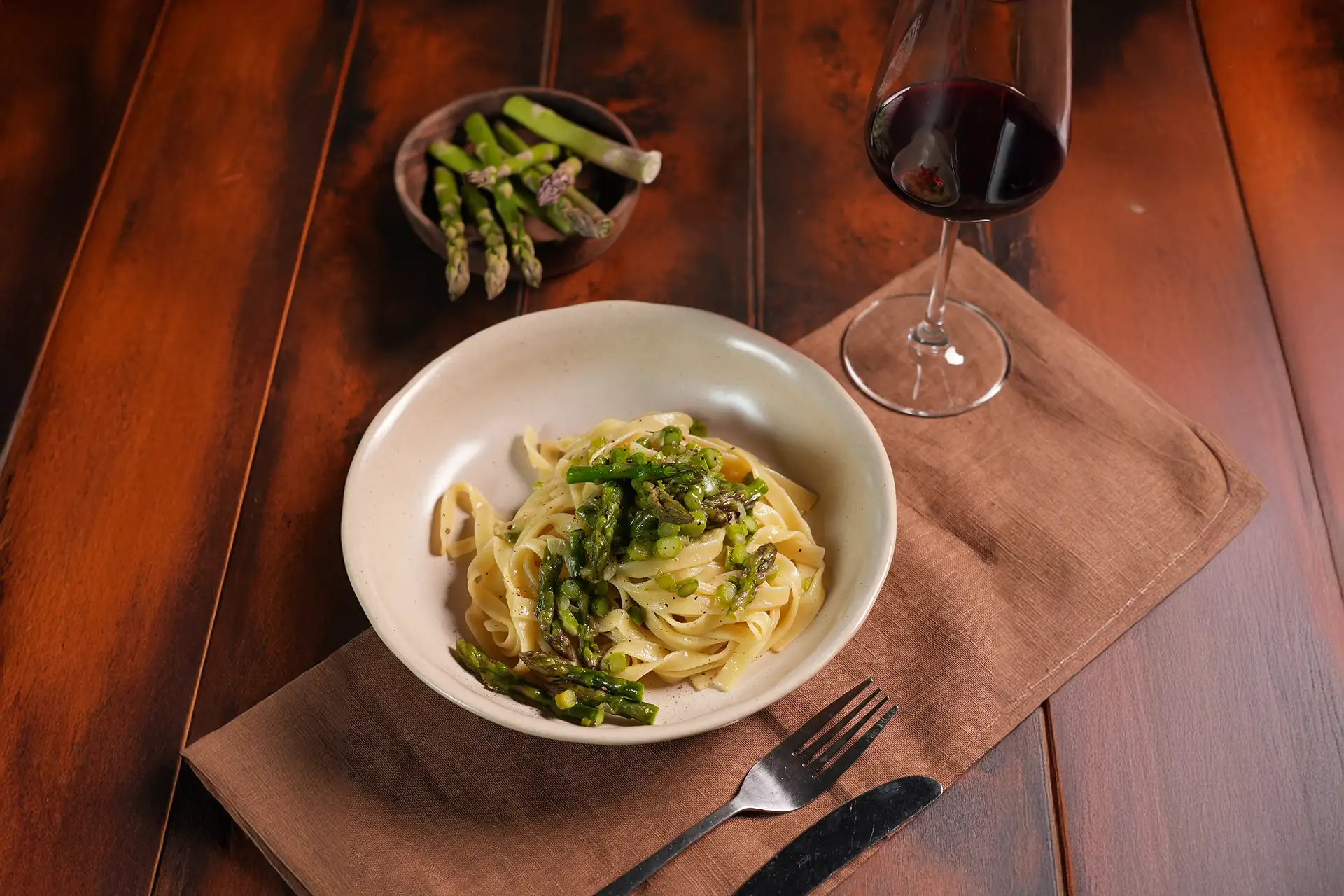 Nel frattempo, cuoci le tagliatelle in abbondante acqua salata. Quando la pasta è al dente, scolala direttamente nella padella con gli asparagi. Manteca con un po' di acqua di cottura della pasta e abbondante Parmigiano Reggiano grattugiato.